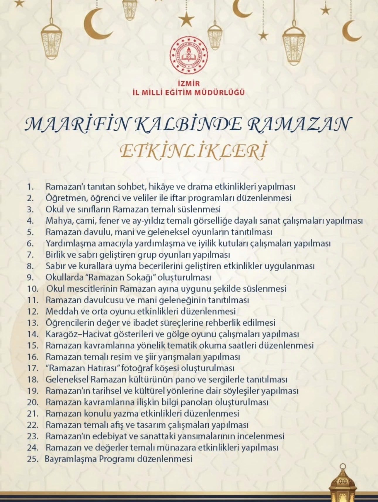 Buca İlçe Milli Eğitim Müdürlüğü, Milli Eğitim Bakanlığı (MEB) tarafından Ramazan ayının manevi atmosferini eğitim ortamlarına taşımak amacıyla hayata geçirilen “Maarifin Kalbinde Ramazan Etkinlikleri” uygulaması kapsamında hazırlık çalışmalarına başladı.