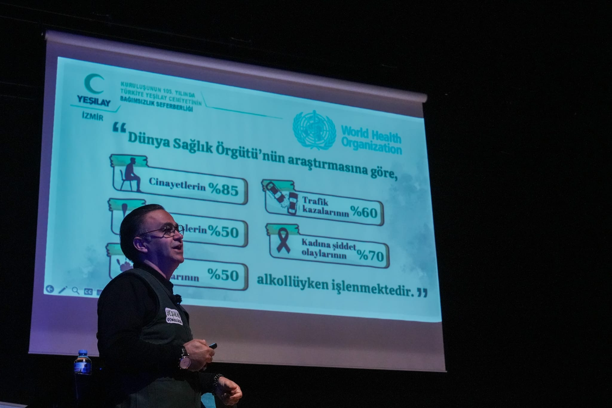 İşgalin en zorunun ve en kötüsünün bağımlılık olduğuna dikkat çeken Yahşi, sözlerine şunları ekledi: "Bağımlılık mücadelesinde kaybedilmiş her fert, vatan sathından koparılmış bir karış topraktır. Ülkemiz, en büyük gücünü genç nesillerden almıştır." Yeşilay kurucusu Ord. Prof. Dr. Mazhar Osman Uzman'ın bu konudaki vizyonunun altını çizen Yahşi, Yeşilay'ın 1934'te kamu yararına çalışan kurum olmasının Gazi Mustafa Kemal Atatürk tarafından onaylandığını belirtti. Ayrıca Dünya Sağlık Örgütü'nün kabul ettiği beş çeşit bağımlılıkla ilgili bilgi veren Yeşilay İzmir Şube Başkanı Dr. Ömer Yahşi, konuya ilişkin resmi verilerle birlikte Türkiye'nin bağımlılıkla ilgili durumuna da değinerek ve gerçek hayat hikayelerinden örnekler verdi.